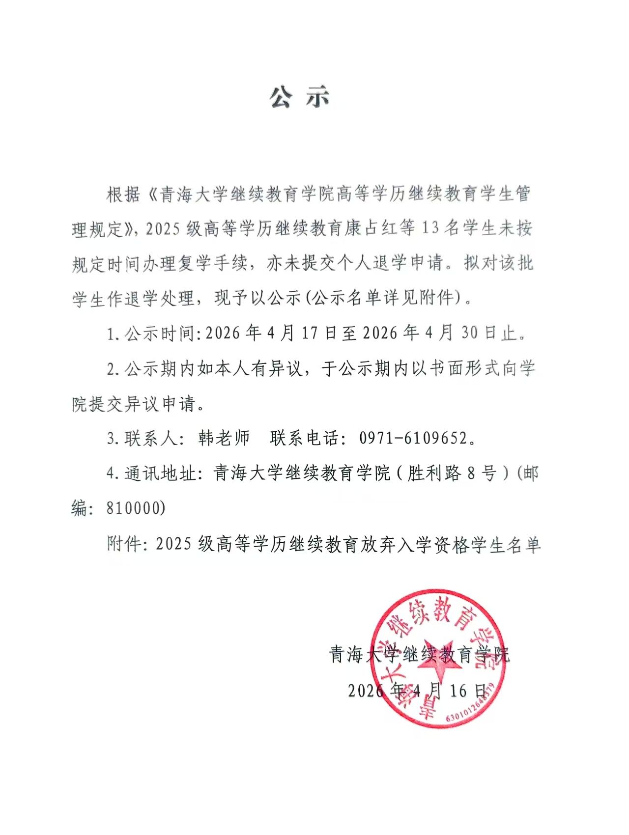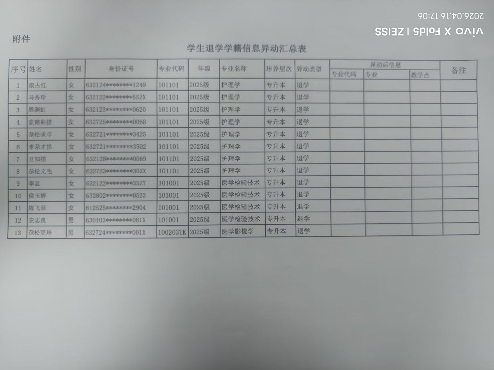 2025级康占红等13名学生退学的公示