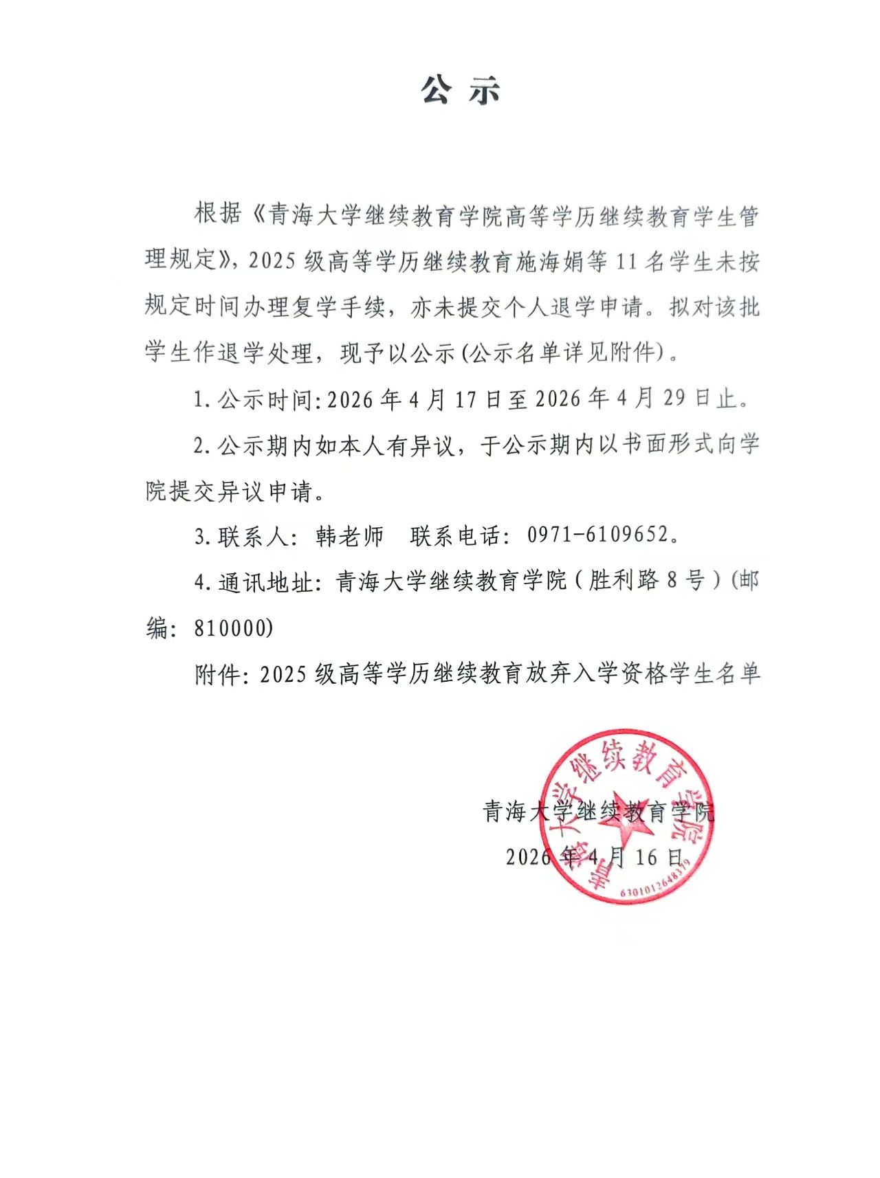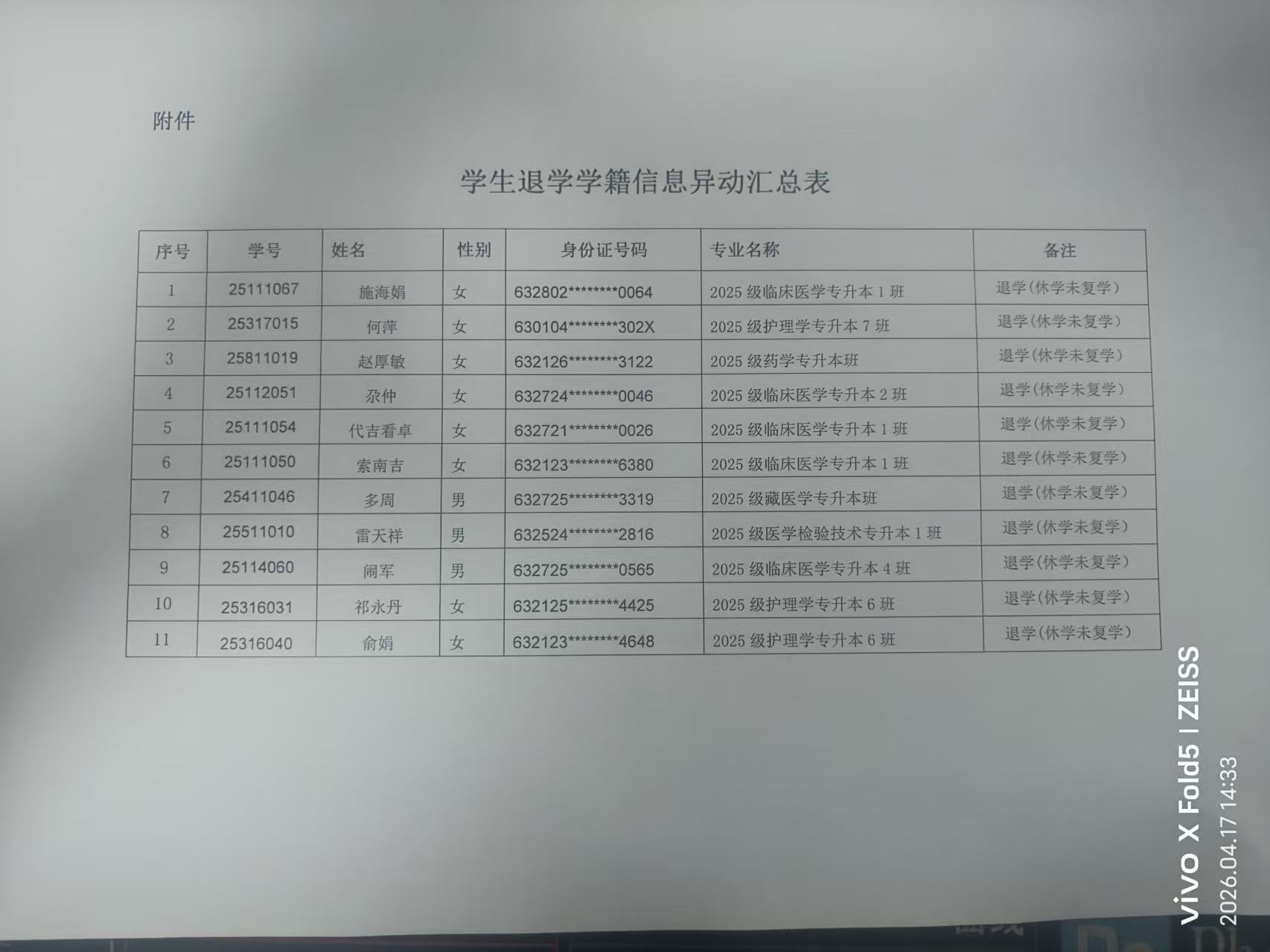 2025级施海娟等11名学生休学未复学的退学公示